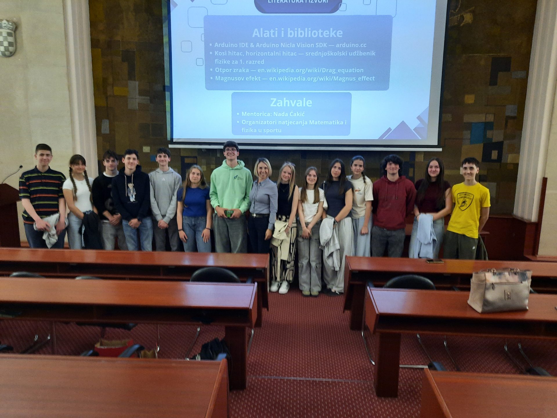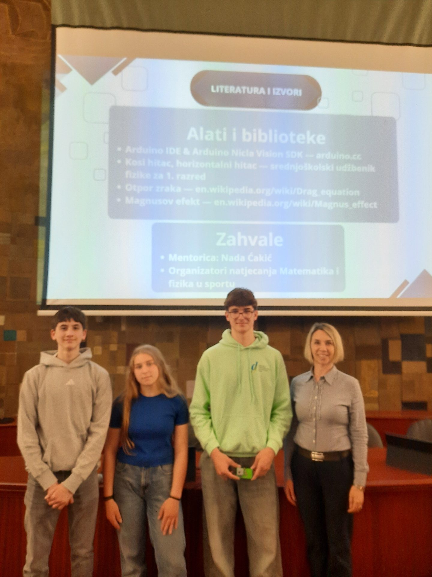 Kada je Društvo matematičara i fizičara iz Rijeke objavilo natjecanje u istraživačkim radovima s temom Matematika i fizika u sportu, odmah smo se zainteresirali za to. Dogovorili smo se da ćemo imati dvije ekipe i prijaviti dva rada. Prvu ekipu činili smo ja, Filip Peršurić Bernobić, Sara Livak i David Dinić i naša je teme bila Kosi hitac u nogometu. U drugoj ekipi su bili Arian Matić, Mia Kuhar i Lana Babić, a njihova tema bila je Poluga pri podizanju utega. Na natjecanje se prijavilo 13 ekipa. Naš je rad Kosi hitac u nogometu proglašen za najbolji. Bili smo jako sretni i ponosni. Nagradu smo primili u Riječkoj gradskoj vijećnici, a cijeli je naš razred došao podržati nas. Kratko ću opisati rad, kako je nastajao i što smo sve radili.